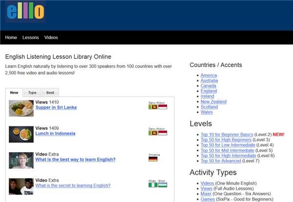 Elllo 网是英语听力在线实验室,有来自世界各地说英语的人的听力素材,主要聚焦在练习听力技能。有各种不同的话题,比如体育、旅游、游戏等,更棒的是每个音频播放器下都会有相关的听力文本,让你可以边听边对照。