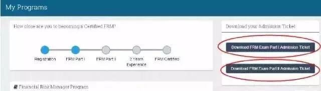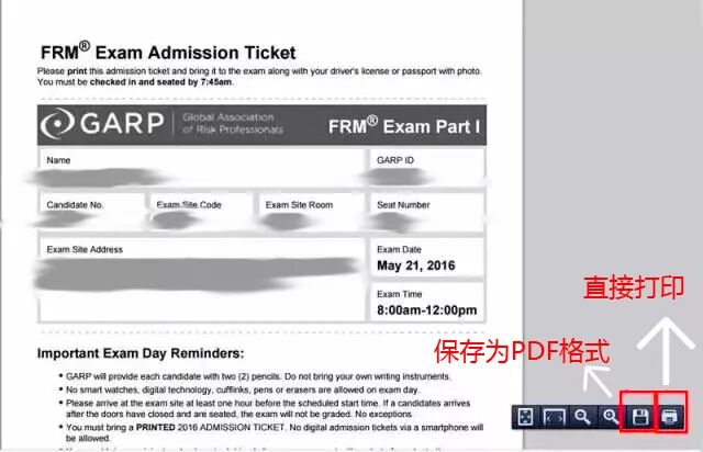 FRM准考证打印详细教程 第一步:登入协会官网(http://www.garp.org/),登入个人账户 第二步:点击My Programs 第三步:点击右侧Download FRM Part I/II Admission Ticket 第四步:进入到打印准考证页面 1、有打印机的,直接打印 2、没打印机的,可以先保存为PDF格式,然后再去打印 特别提醒: 1、收到准考证打印邮件后,请在第一时间确认是否可以下载打印。也尽可能早的开始打印。(曾经有过,考前一天因大量考生在同一天打印准考证而造成网站瘫痪而无法打印) 2、在FRM准考证打印前,确认姓名,地点时间等显示的信息是否和证件一致。 3、如发生信息不符或下载错误等问题,请尽快联系协会处理,协会邮箱:memberservices@garp.com 4、FRM考试需要持纸质准考证进入考场,其他形式(含电子版)准考证不予进入考场。 5、请保持纸质FRM准考证的整洁,切记不要在上面乱涂乱画。可以多打印几张,以备不时之需。 6、同时报名FRM一二级考试的考生,FRM准考证需要分开打印,打印方向不做要求。 杭州考点变更 GARP协会官网最新信息显示,2018年5月19日FRM考试杭州考点发生变更了! 在之前GARP协会公布的FRM5月FRM杭州考点地址为:杭州市下城区,德胜路238号,浙江商业职业技术学院第一教学楼; 现在协会公布的2018年5月19日FRM考试杭州最新考点地址为:杭州市西湖区保俶北路87号杭州退休干部大学 最新FRM中国考点